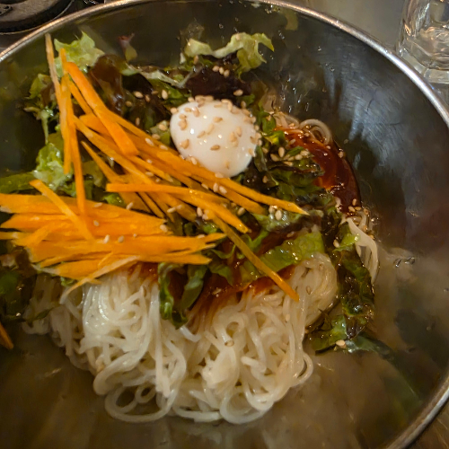 차갑게 먹는 면발과 신선한 채소, 그리고 한 입 크기의 메추리알까지 올라가서 마무리 메뉴로 딱이에요.