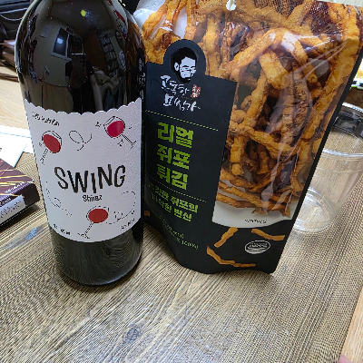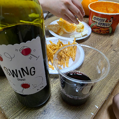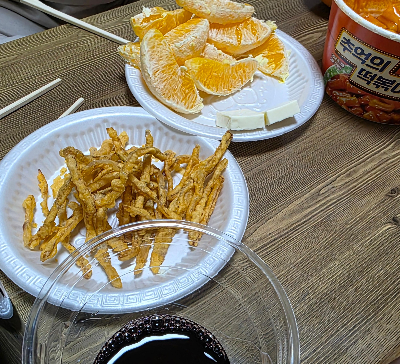 편의점에 들러 와인한병 무알콜 맥주, 떡볶이 오렌지와 크림치즈를 한가득 사들고가서