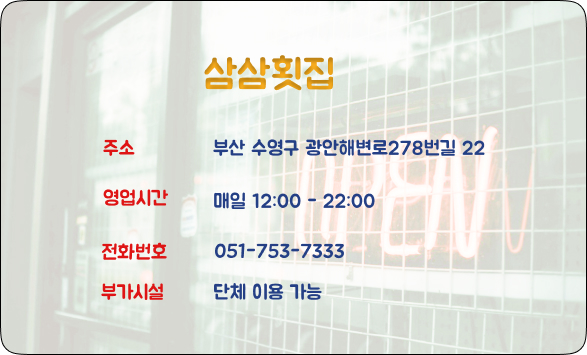 이번 여행에서 우리가 향한 곳은 바로 민락수변공원 근처의 맛집, "삼삼횟집".