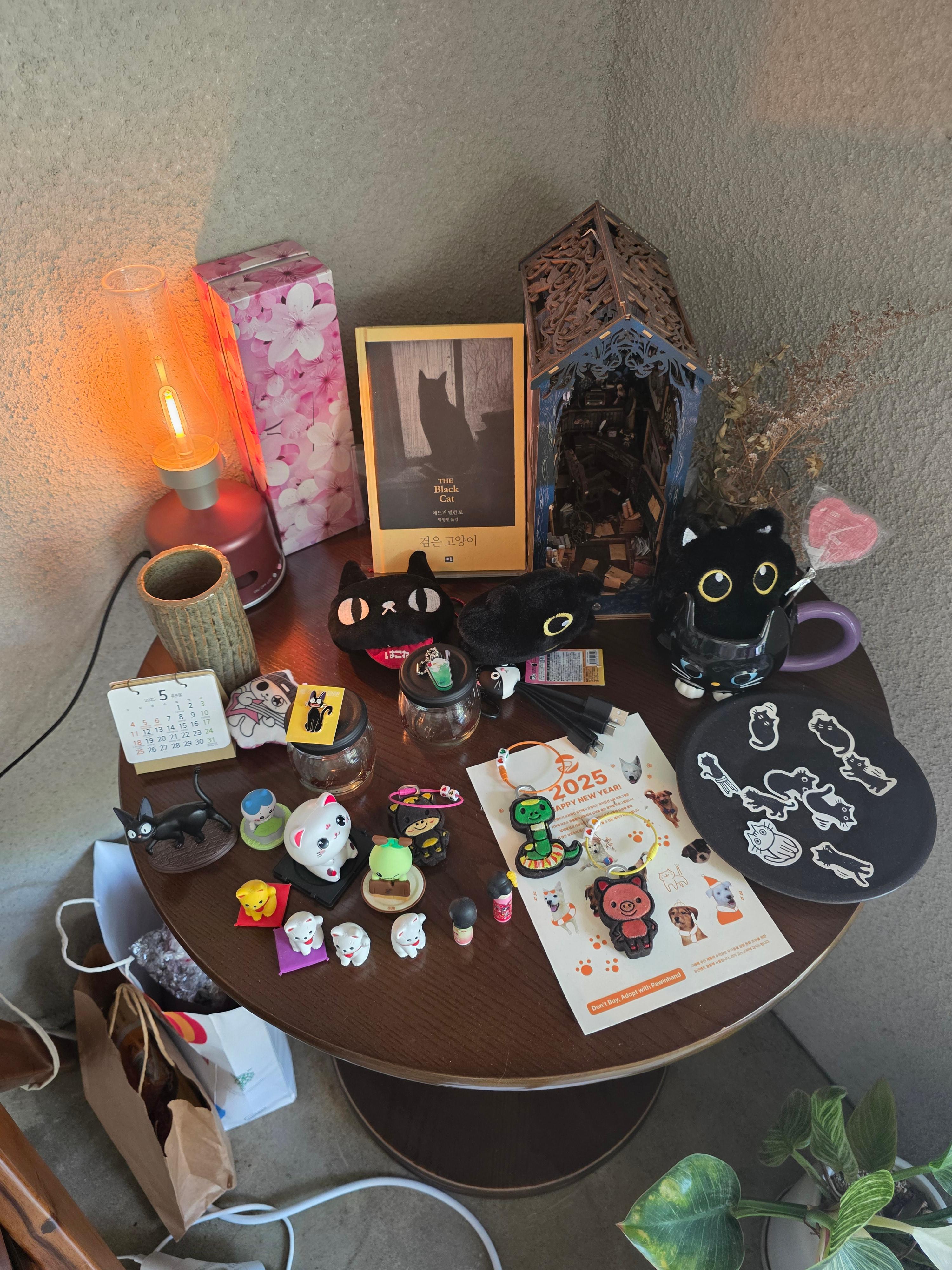 곳곳에 귀엽고 다양한 검은 고양이 인형들, 오브제, 그림들이 있어서
