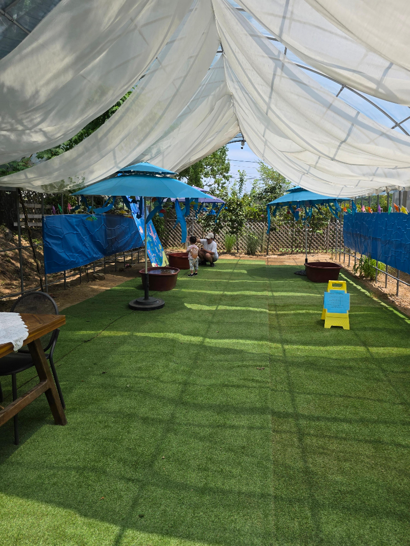 여기는 천가림막이 있는 모모물놀이존이예요 여기에 큰 대야 3개에 물이 받아져 있어서 간단하게 물놀이도 가능해요.