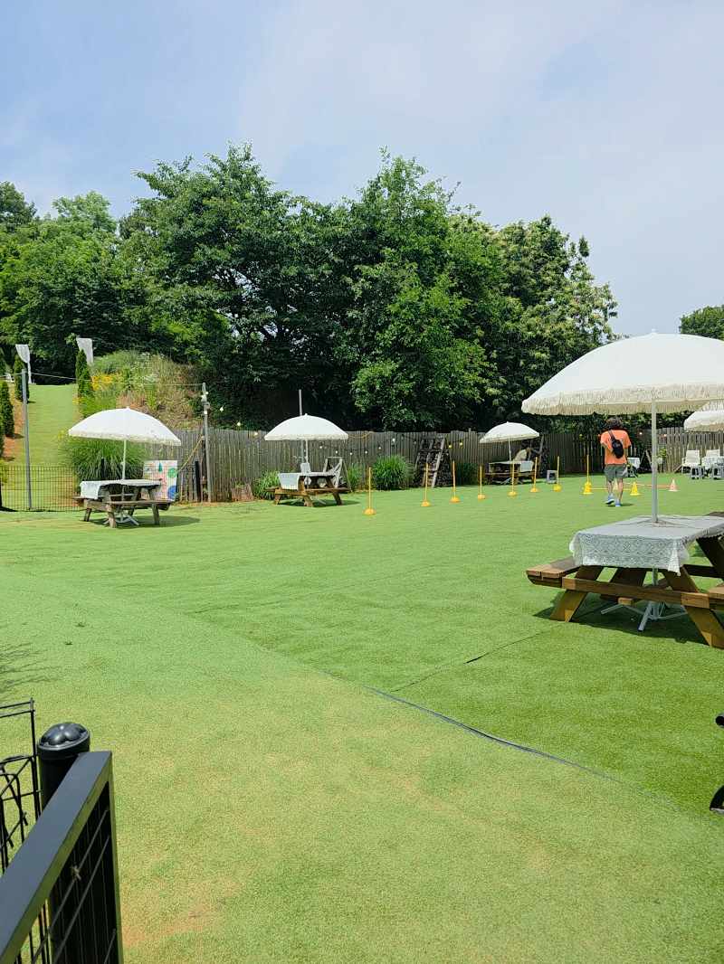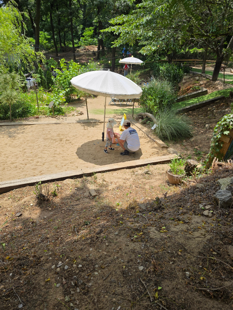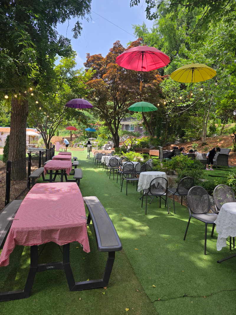 저희는 야외 테이블에서 시간을 보냈는데, 특히 위쪽 나무 숲 아래에 있는 테이블이 시원해서 조카가 노는 걸 보면서 편하게 쉴 수 있었어요.