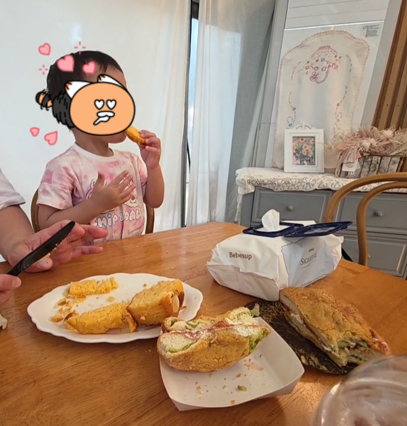 이후에 이후에 조카가 물놀이와 모래놀이 후 먹을 간식을 먹었어요.