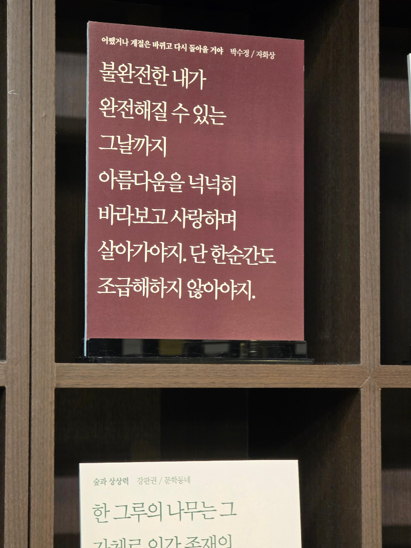 서점 곳곳에는 감성적인 글귀들이 하나씩 놓여 있어서, 책을 읽지 않더라도 충분히 사색에 잠기게 하더라고요.