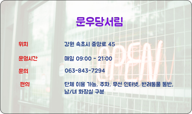 문우당서림은 1984년부터 운영 중인 속초의 대표 로컬 서점이에요.