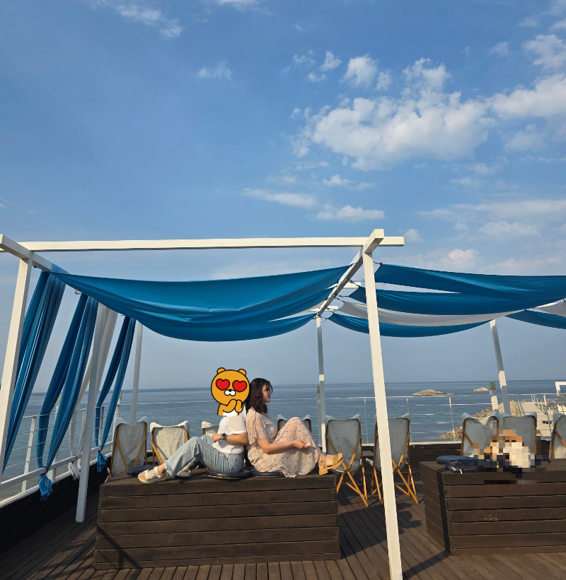 그리고 하이라이트는 바로 3층 루프탑! 화이트와 블루톤의 캐노피 아래, 바다를 바라보는 것만으로도 힐링 그 자체였어요.