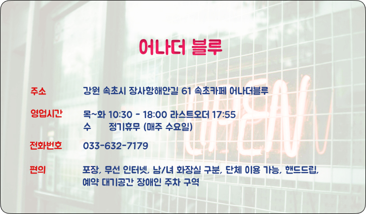 감성과 여유를 다 담은 속초 여행지로 ‘어나더블루’ 완전 추천합니다. 다음 여행에도 저는 무조건 재방문할 거예요.