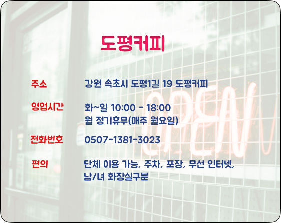 그럴 때 딱 어울리는 곳이 바로 이곳, 속초 도평에 위치한 신상 감성카페 ‘도평커피’였어요.