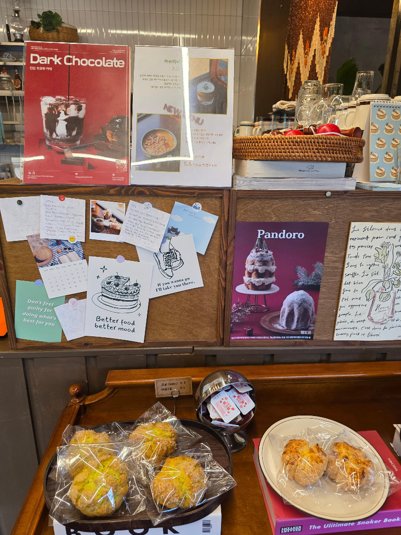 디저트류로는 수제 케이크와 쿠키 종류가 있었어요. 메뉴판 구성은 단순하지만 고심해서 만든 듯한 느낌이었어요.