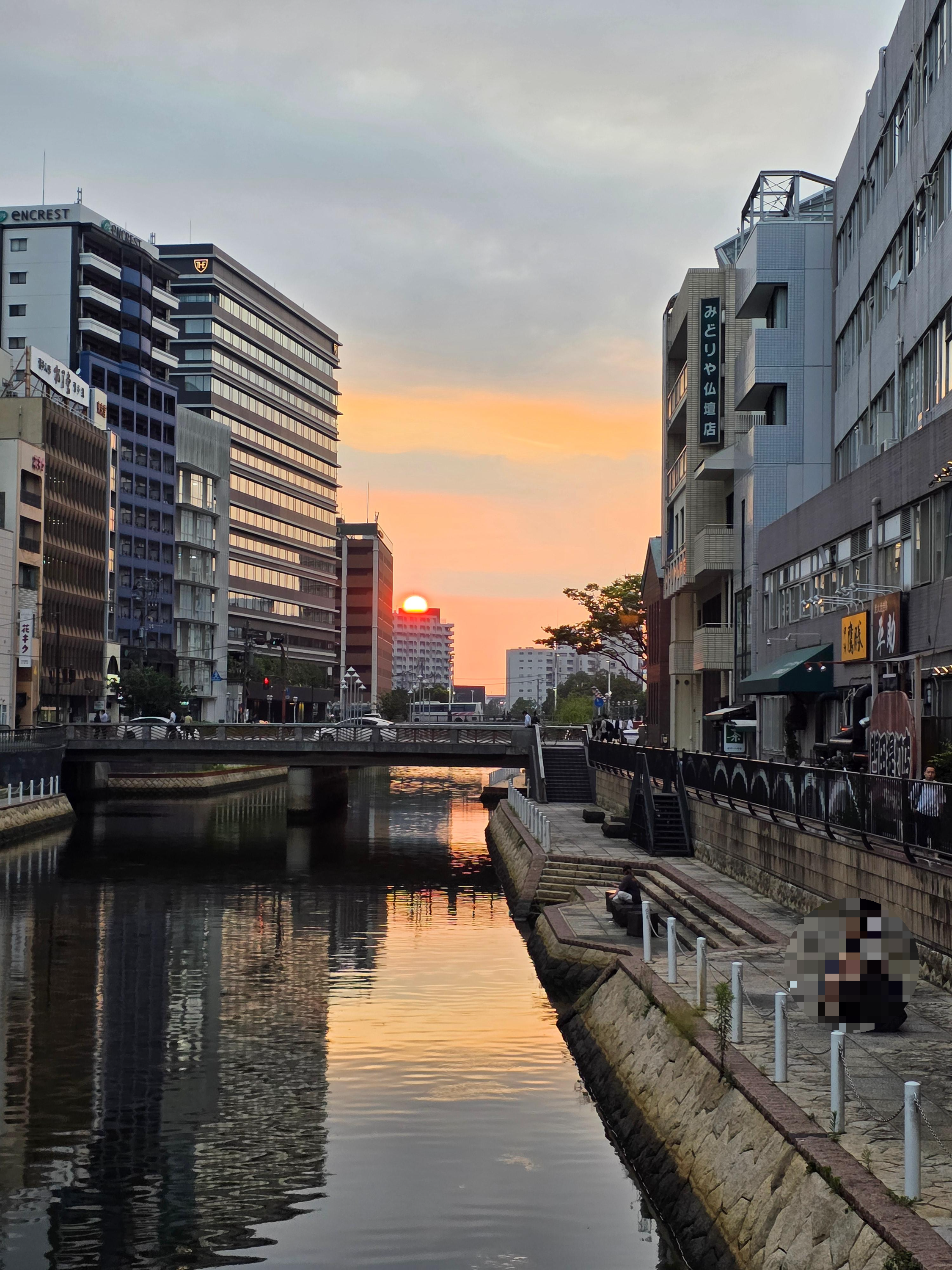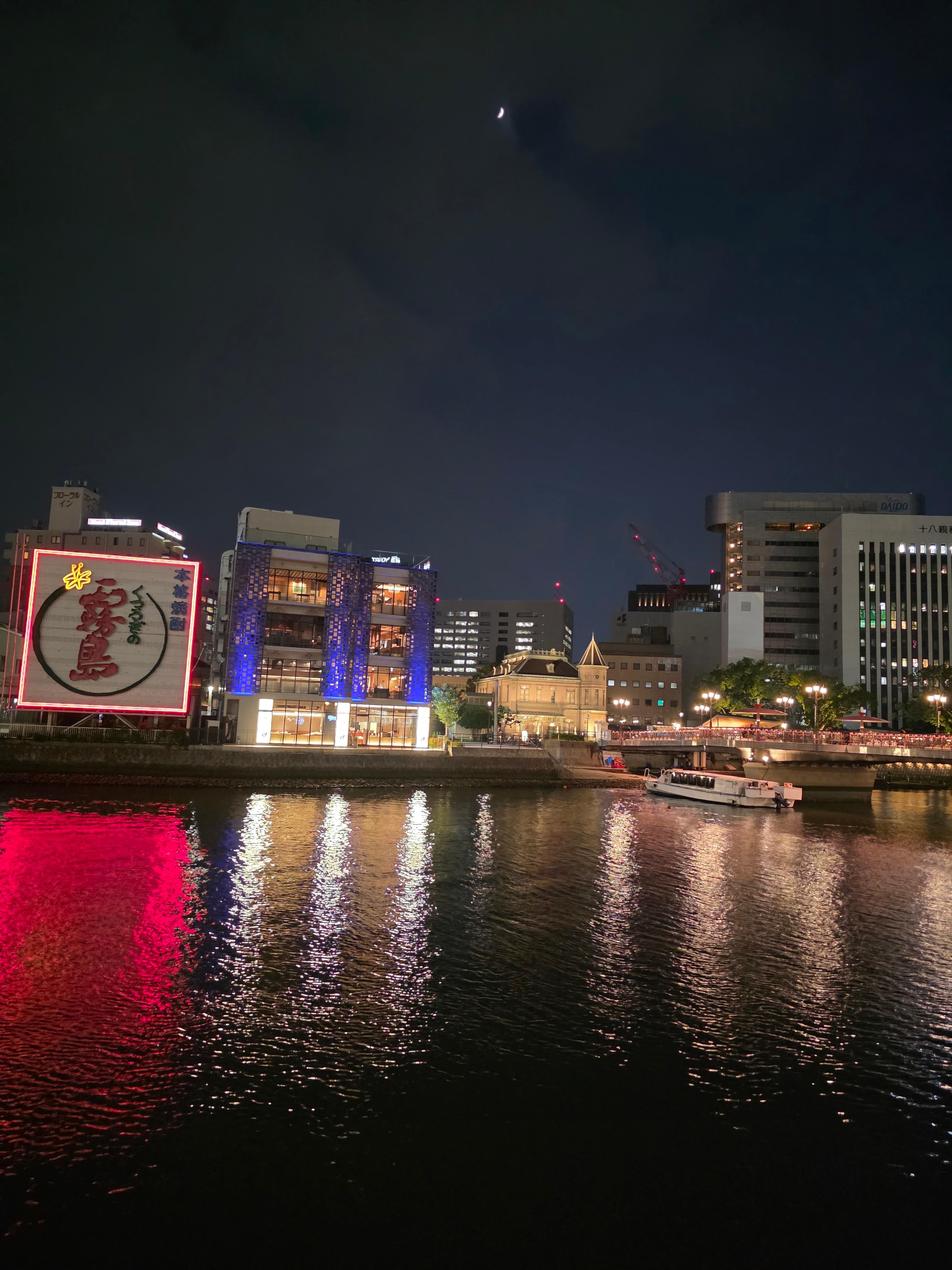 후쿠오카 자유여행의 첫날 저녁, 나카스강을 바라보며 친구랑 천천히 걷고 있었어요.