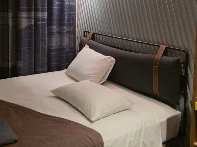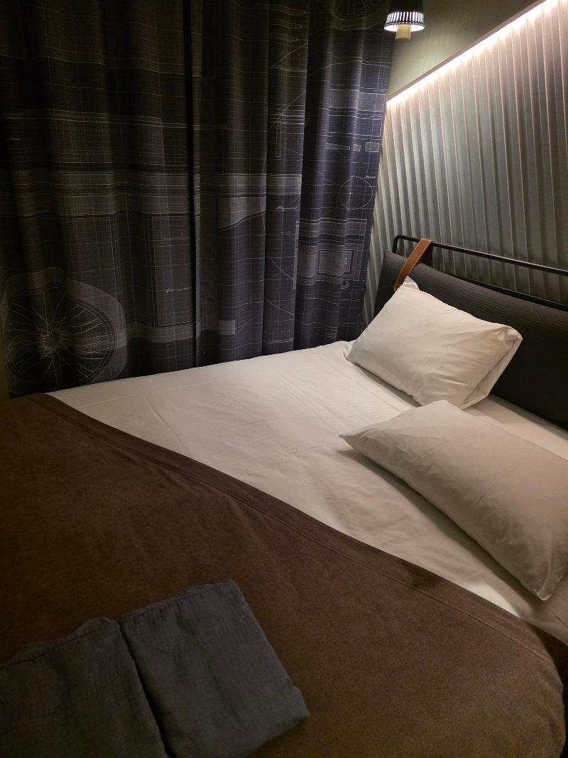 침대 위 쿠션이 끈으로 묶여 있는 인테리어 포인트, 너무 인상 깊었어요.처음엔 ‘어? 왜 이렇게 해놨지?’ 싶었는데 보면 볼수록 귀엽고 센스 있는 디테일! 전체적으로 모던하면서도 독특한 감성이 객실에도 녹아 있었어요.
