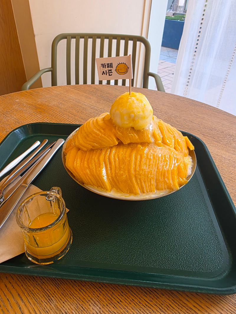 여수에서 시원하고 제대로 된 빙수를 찾는다면 시즌카페가 정답이에요. 신선한 과일이 그날그날 바로 올라가는 퀄리티가 진짜 마음에 들었고, 무엇보다 생망고빙수의 맛이 정말 찐! 와플도 수제라서 카페 퀄리티를 한층 더 높여주더라고요.