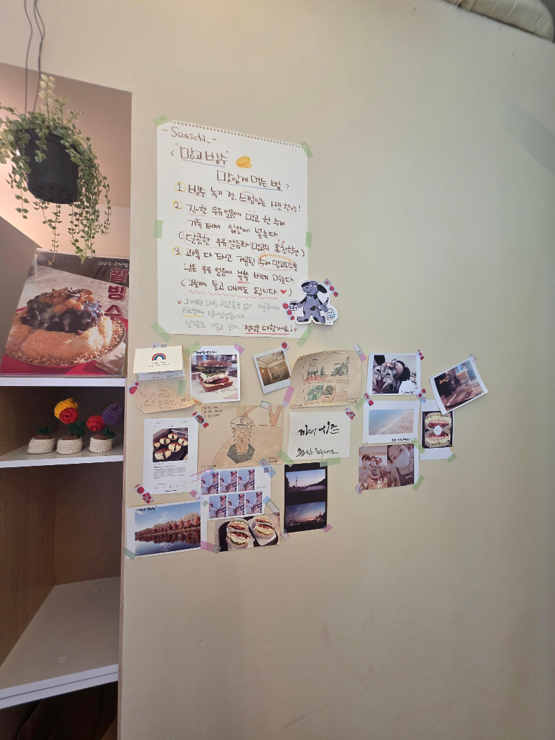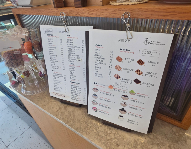 시즌 카페의 메뉴판은 다양한 과일 빙수와 수제 팥빙수, 그리고 수제 벨기에 와플로 가득 차 있어요. 메뉴는 제철 과일을 활용한 다양한 조합으로 구성되어 있어서, 매 방문마다 새로운 맛을 경험할 수 있습니다. 특히 추천하는 메뉴는 생망고, 흑임자 빙수, 그리고 수제 와플이에요.