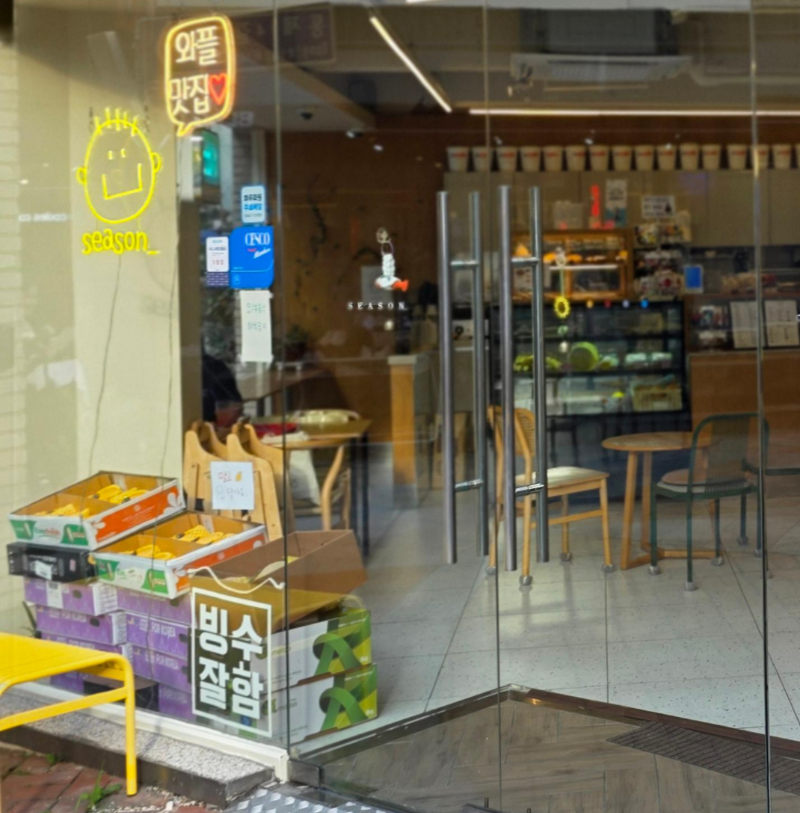 여수 여행 중, 너무 더워서 시원한 빙수가 간절했어요. 그때 눈에 띈 곳이 바로 여수 현지인들도 인정하는 시즌카페였답니다. 매장 앞에 박스로 가득 쌓인 생망고를 보는 순간, ‘여긴 진짜다!’라는 생각이 확 들었어요. 빙수나 주스에 들어가는 과일을 이렇게 직접 쌓아두고 쓰는 집이라니...신선함이 보장될 수밖에 없겠죠?